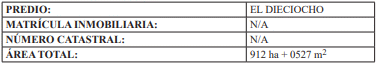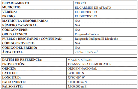 Artículo 1°. Constitución de Resguardo. Constituir el resguardo indígena Embera Katío El Dieciocho con un globo de terreno de novecientos doce hectáreas, quinientos veinticuatro metros cuadrados (912 ha 0524 m2), según plano ACCT:272451257, cuya área está conformada por dos predios del Fondo Nacional Agrario denominados La Noche identificado con el Folio de matrícula 180-37410, y La Playa identificado con el Folio de matrícula 180-37409 más 651 hectáreas más 2205 m2 correspondientes a baldíos de la nación, como se describe en la parte motiva de la presente providencia, ubicados en jurisdicción del municipio de Carmen del Atrato, departamento del Chocó, comprendido dentro de los siguientes linderos técnicos: