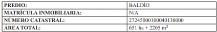 El Predio se encuentra seccionado por la zona de exclusión definida para la vía Quibdó - Medellín, por tal razón se definen los linderos para dos globos: el Globo 1 es el que se encuentra al costado Norte de la vía en el sentido Quibdó – Medellín y el Globo 2 el que se encuentra al sur de esta.
