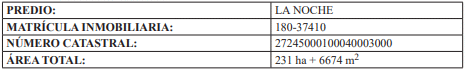 Del Punto número (241) se sigue en dirección Noroeste colindando con el predio La Noche, en una distancia acumulada de 880.31 metros en línea recta, pasando por el Punto número (240) de coordenadas planas N = 2192424.62 m, E = 4627787.86 m, hasta encontrar el Punto número (239) de coordenadas planas N = 2192440.33 m, E = 4627317.73 m.