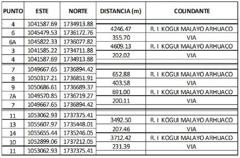 Del Punto número 137, se sigue en dirección general noroeste, colindando con el Resguardo Indígena Kogui Malayo Arhuaco en línea quebrada, en una distancia de 1318.21 metros, hasta encontrar el Punto número 138, de coordenadas planas N= 1729442.02 m., E= 1054040.84 m., ubicado borde derecho aguas abajo del río Palomino.