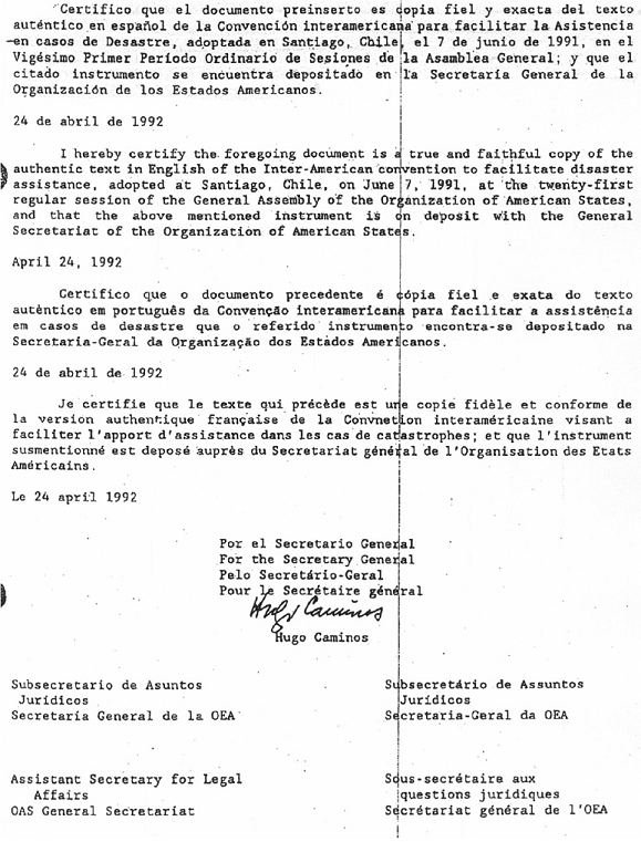 (Para ser transcrito en este lugar, se adjunta copia del texto de la “Convención Interamericana para facilitar la asistencia en casos de desastre”, adoptada en Santiago de Chile, República de Chile, el 7 de junio de 1991).
