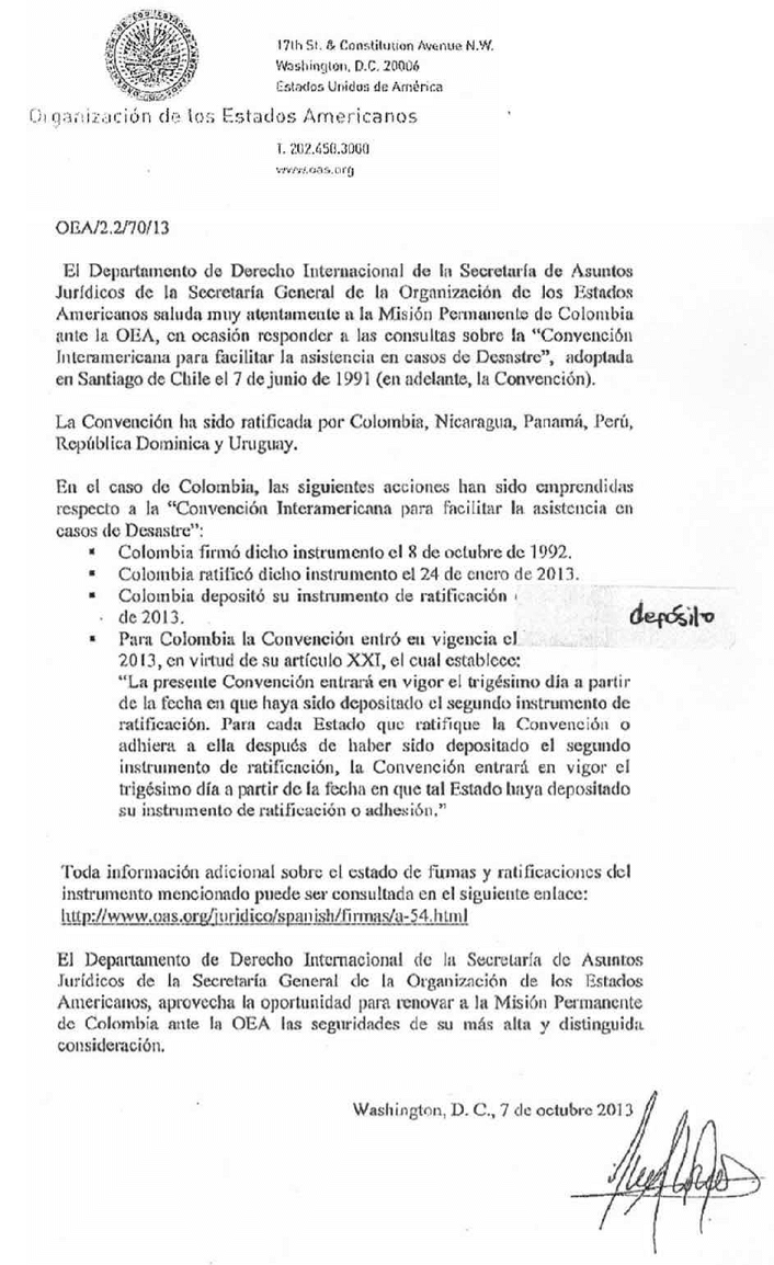 Que el Gobierno de la República de Colombia depositó el Instrumento de Ratificación de la “Convención Interamericana para facilitar la asistencia en casos de desastre”, adoptada en Santiago de Chile, República de Chile, el 7 de junio de 1991, ante la Secretaría General de la Organización de Estados Americanos (OEA), en calidad de depositario del tratado, el día 22 de marzo de 2013;