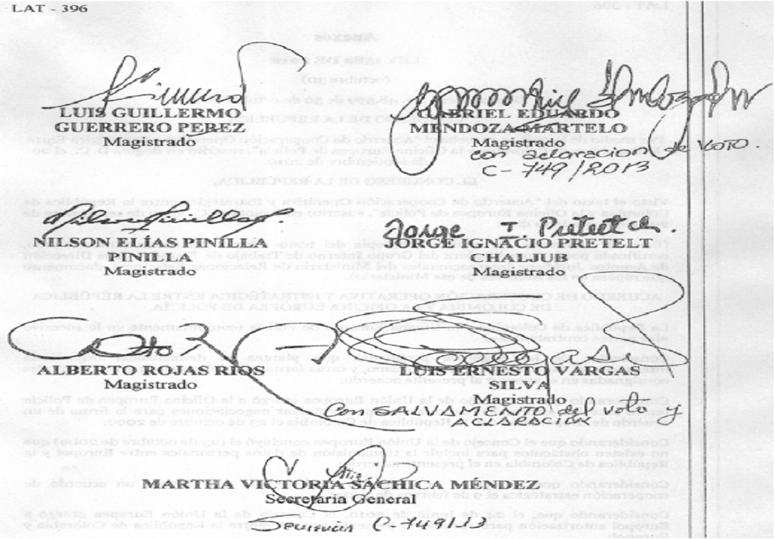 Que la Corte Constitucional, en Sentencia C-749 de 2013 de fecha 30 de octubre de 2013, declaró exequible la Ley 1582 de 30 de octubre de 2012 y el “Acuerdo de Cooperación Operativa y Estratégica entre la República de Colombia y la Oficina Europea de Policía”, suscrito en Bogotá, D. C., República de Colombia, el 20 de septiembre de 2010;