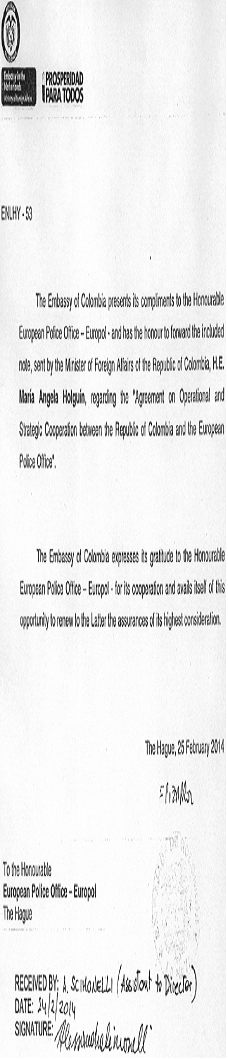 Que mediante Nota Diplomática número S-GTAJI-14-007565 de fecha 17 de febrero de 2014, el Ministerio de Relaciones Exteriores de la República de Colombia notificó a la Oficina Europea de Policía (Europol) sobre el cumplimiento de los trámites exigidos por su legislación interna para la entrada en vigor del “Acuerdo de Cooperación Operativa y Estratégica entre la República de Colombia y la Oficina Europea de Policía”, suscrito en Bogotá, D. C., República de Colombia, el 20 de septiembre de 2010;