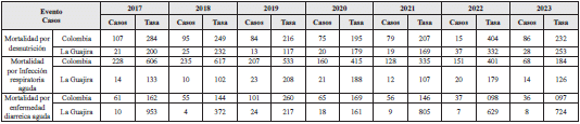 Que el análisis a la semana epidemiológica 23, para el periodo 2017-2023, muestra que el departamento de La Guajira registra valores por encima del nivel nacional y aumento en las tasas de mortalidad por desnutrición para los años 2022 y 2023 en comparación con los años anteriores de la serie, así como aumento para el último año en la mortalidad por EDA. (Tabla 4).