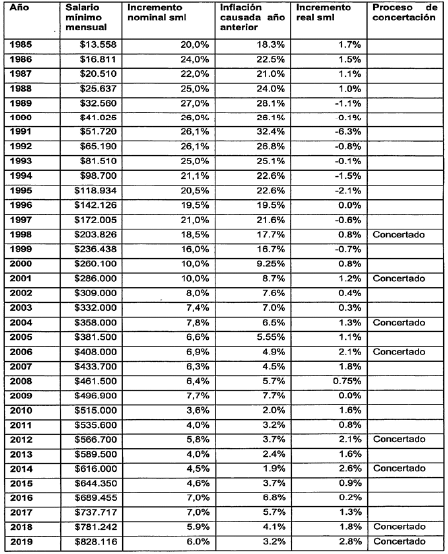 Que, con el fin de promover este objetivo señalado en el Plan Nacional de Desarrollo, se ha fortalecido el ingreso real de los trabajadores remunerados con el salario mínimo, con incrementos por encima de la inflación y superiores a los de años anteriores, como muestra el siguiente cuadro que contiene los incrementos reales al salario mínimo desde 1985: