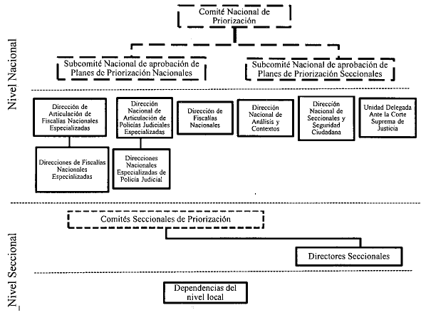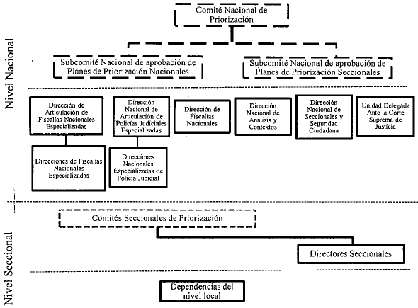 El nivel nacional está compuesto por el Comité Nacional de Priorización, como órgano rector de la política, los Subcomités Nacionales que aprueban planes de priorización, y las dependencias cuya competencia de casos es asignada, de acuerdo con su especialidad, directamente por el Fiscal General de la Nación. Respecto de las dependencias misionales, este nivel está conformado por la Fiscalía Delegada ante la Corte Suprema de Justicia, la Dirección Nacional de Análisis y Contextos, la Dirección de Articulación de Fiscalías Nacionales Especializadas y sus Direcciones de Fiscalías Nacionales, la Dirección Nacional de Seccionales y Seguridad Ciudadana, la Dirección de Articulación de Policías Judiciales Especializadas y sus respectivas Direcciones Nacionales de Policías Especializadas, y la Dirección Nacional de Cuerpo Técnico de Investigaciones.