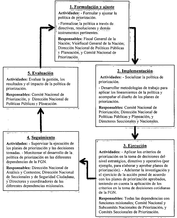 La Directiva diseña el ciclo de la política pública de priorización, enfocándose en el funcionamiento integral de la política y adaptándolo al proceso de modernización que se ha venido realizando en la FGN. En tal medida, se establecen cinco fases (cada una con unas dependencias y personas responsables): 1. Formulación y ajuste; 2. Implementación; 3. Ejecución; 4. Seguimiento; y 5. Evaluación. Con ello se busca (i) poner a funcionar una estructura suficientemente descentralizada de acuerdo con la cual el nivel estratégico pueda focalizar su atención en diseñar los lincamientos, verificar su cumplimiento y formular los ajustes necesarios, sin tener que tomar decisiones del orden operativo; (ii) que la ejecución y el séguimiento de la aplicación de los lincamientos de la política sea responsabilidad de todas las dependencias misionales del orden nacional y seccional, de tal manera que la aplicación de los criterios de priorización permee las decisiones cotidianas de la Fiscalía a través de sus fiscales e investigadores; y (iii) articular y coordinar el accionar de todas las dependencias estratégicas y misionales de la FGN.