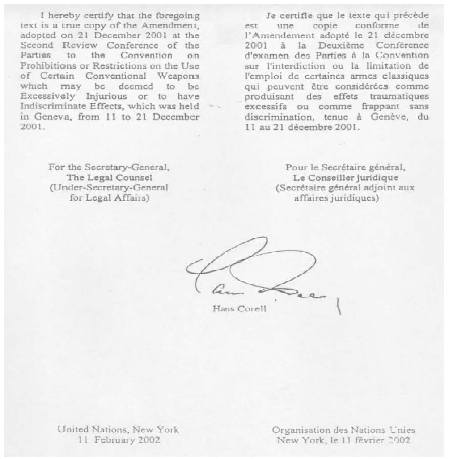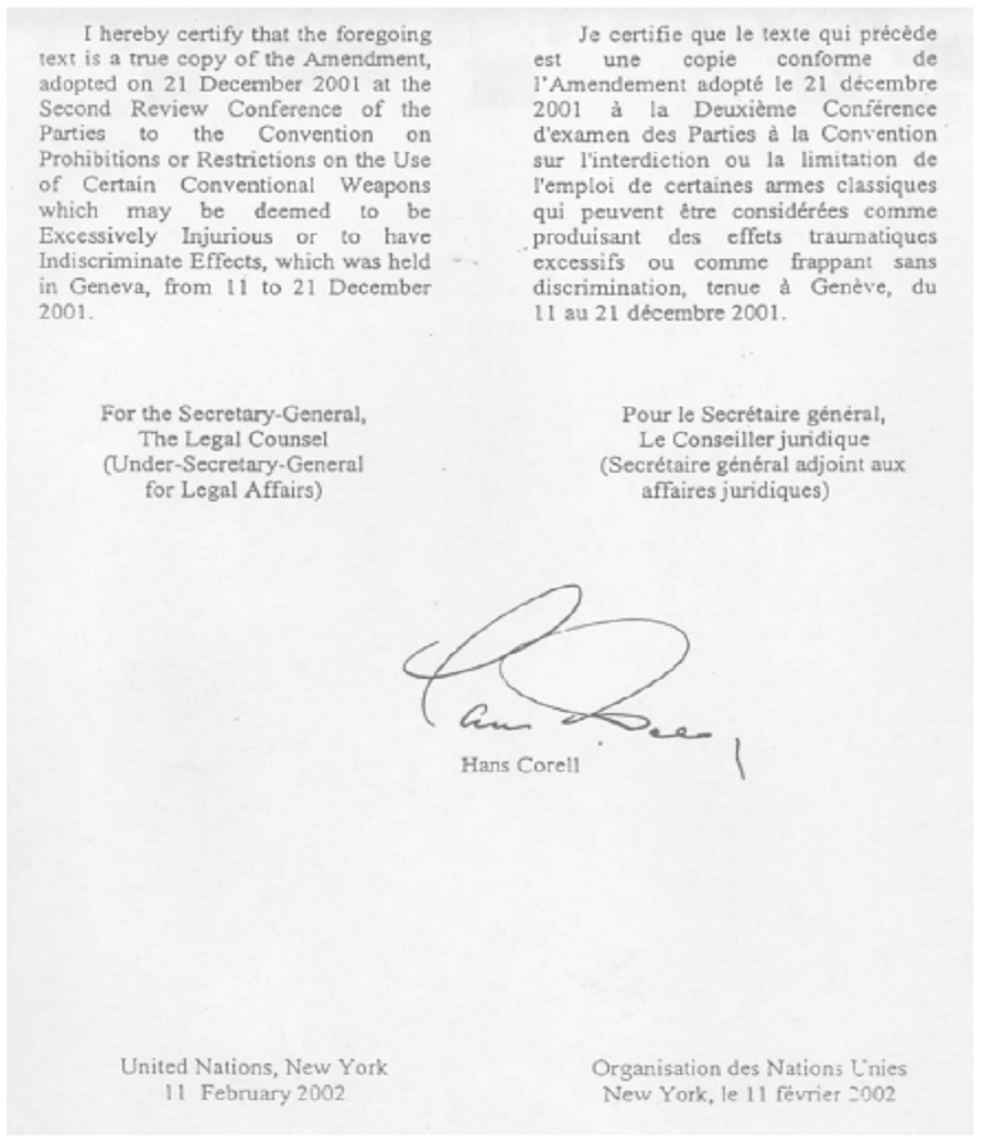 Los Estados Partes en la II Conferencia de Examen, celebrada del 11 al 21 de diciembre de 2001, adoptaron la siguiente decisión de enmendar el artículo I de la Convención para ampliar el ámbito de su aplicación a los conflictos armados no internacionales. Esta decisión figura en la Declaración Final de la II Conferencia de Examen, que se publica con la signatura CCW/CONF.II/2.