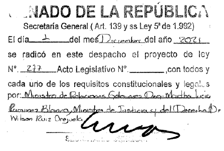 Presentado al honorable Congreso de la República por la Ministra de Relaciones Exteriores y el Ministro de Justicia y del Derech o.