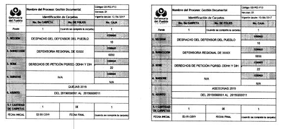 7. Folios del 1 al 197. Cada expediente en la carpeta de cada tipo de petición, se organizará así:Expedientes correspondientes a vigencias del año 2017 o anteriores