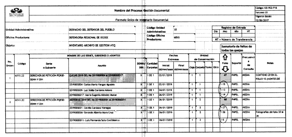 | 1 | Quejas | 22. DERECHOS DE PETICIÓN PQRSD-DDHH Y DIH | N/A | Quejas 2018; 898999 a 989877 | • Queja escrita (si aplica) • Formulario recepción AT-P01-F09 • Formulario AT-P01-F01 (si aplica) • Formulario AT-P01-F04 (si aplica) • Comunicaciones oficiales • Formulario de cierre AT-P01-F10 |