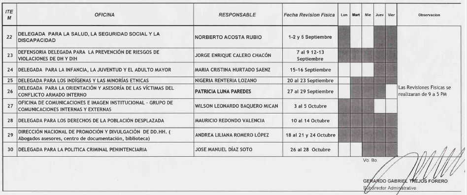 Por lo anterior, remito fotocopia del cronograma de visitas programadas en cada una de las oficinas, con el fin de que la mencionada labor se adelante con agilidad y con la colaboración del servidor público que asigne el Jefe de cada dependencia para esta actividad.