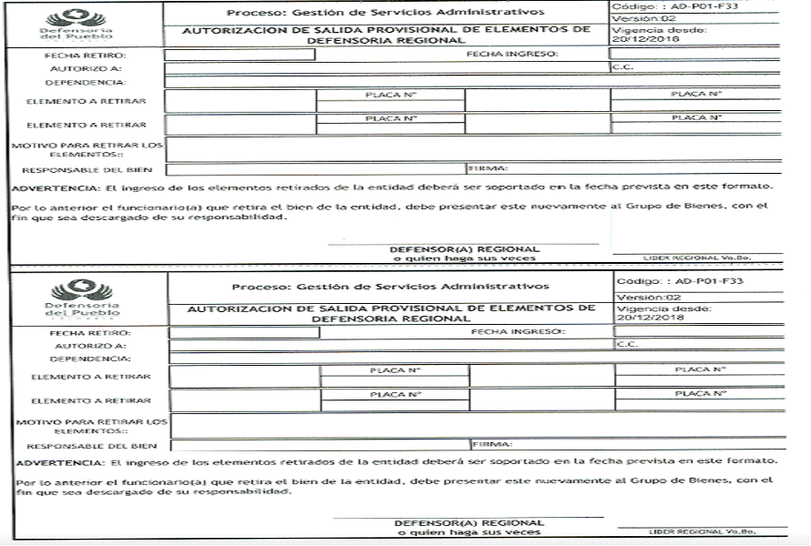 Adicionalmente, se adjuntan los formatos respectivos, AD-PO1-F33 (Autorización Salida Provisional de Elementos de la Regional) y AD-P01-F07 (Seguimiento Autorización de Salida Provisional de Elementos Inventario Subdirección Administrativa), que se deben estar aplicando según la normatividad vigente para el control de bienes de la Defensoría del Pueblo.