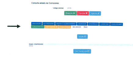 Una vez la comisión ha pasado todos los filtros y es aprobada por el ordenador del gasto, pasa al grupo de viáticos, el botón de Comisión cambia a color naranja.