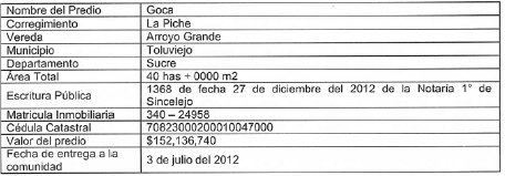 Que el mencionado predio fue adquirido por el extinto Incoder mediante Escritura Pública número 1368 de fecha 27 diciembre de 2012, otorgada en la Notaría Primera de Sincelejo (Sucre), y entregado provisionalmente, el día 3 de julio del 2012, a la comunidad negra organizada en el Consejo Comunitario de Comunidades Negras “SOCOLANDO”, ubicado en el Municipio de Toluviejo, departamento de Sucre.