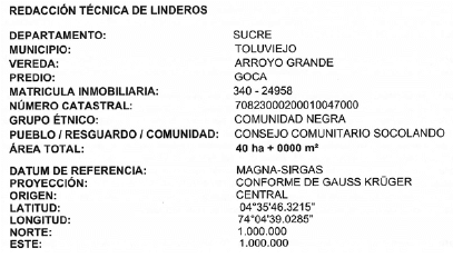 Artículo 1°. Título colectivo. Adjudicar en favor de la Comunidad Negra organizada en el Consejo Comunitario de Comunidades Negras de Socolando, ubicada en el municipio de Toluviejo, departamento de Sucre, representado legalmente por el señor Francisco Ozuna Oliveros, identificado con cédula de ciudadanía número 9042440 de San Onofre (Sucre), el predio denominado “Goca”, ubicado en la vereda Arroyo Grande, jurisdicción del municipio de Toluviejo, departamento de Sucre, identificado con folio de matrícula inmobiliaria No. 340 – 24958 de la Oficina de Registro de Instrumentos Públicos de Sincelejo (Sucre), el cual cuenta con una extensión de cuarenta hectáreas (40 ha 0000 m2), menos el área de la faja paralela a la línea de cauce permanente de los ríos, arroyos y lagos, hasta treinta (30) metros de ancho, descrito en el plano ACCTI 70823625 de junio de 2020, elaborado por la Agencia Nacional de Tierras – Subdirección de Asuntos Étnicos, el cual cuenta con los siguientes linderos técnicos: