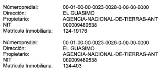 Igualmente, con los predios identificados con el número predial: 00-01-00-00-0023- 0028-0-00-00-0000, dirección: El Guásimo, propietario: Agencia-Nacional de Tierras (ANT)-, NIT. 9009489538, Matrícula Inmobiliaria: 124-19176 y número predial: 00-01- 00-00-0023-0026-0-00-00-0000, Dirección: El Guásimo, Propietario: Agencia Nacional de Tierras (ANT), NIT. 9009489538, Matrícula Inmobiliaria: 124-403, los cuales son los mismos que se pretenden titular en calidad de “tierras de comunidades negras” al Consejo Comunitario Bodega-Gualí, este traslape obedece a que los procesos de formación catastral son realizados con métodos de fotointerpretación y fotorestitución a partir de fotografías aéreas con algunas inspecciones oculares en campo, no es correcto compararlos con un levantamiento topográfico que registra a detalle la geometría y el área de los linderos consignados en los documentos que generan y sustenta la propiedad - escritura y folio de matrícula inmobiliaria; ya que los resultados provienen de técnicas diferentes con objetivos distintos, así como, a las diferencias con la información catastral del IGAC.