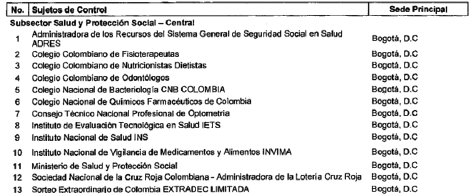 ARTÍCULO 13. CONTRALORÍA DELEGADA PARA EL SECTOR SALUD. <Resolución derogada por el artículo 32 de la Resolución REJ-EJE-0088 de 2021> La Contraloría Delegada para el Sector Salud será competente para ejercer la vigilancia y el control fiscal a los siguientes sujetos de control: