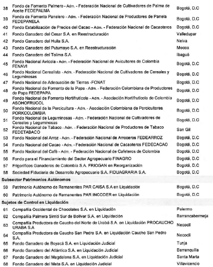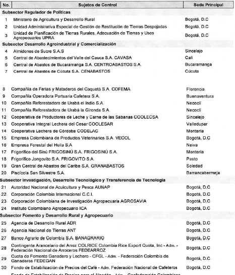 ARTÍCULO 2o. CONTRALORÍA DELEGADA PARA EL SECTOR AGROPECUARIO. <Resolución derogada por el artículo 33 de la Resolución REG-EJE-0093 de 2021> La Contraloría Delegada para el Sector Agropecuario, será competente para ejercer vigilancia y control fiscal a los siguientes sujetos de control: