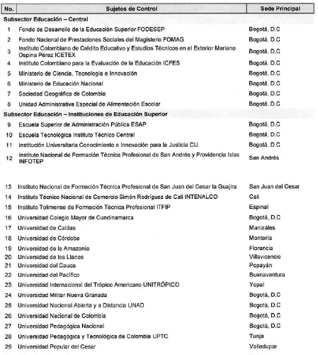 ARTÍCULO 6o. CONTRALORÍA PARA EL SECTOR EDUCACIÓN, CIENCIA Y TECNOLOGÍA, CULTURA, RECREACIÓN Y DEPORTE. <Resolución derogada por el artículo 33 de la Resolución REG-EJE-0093 de 2021> La Contraloría Delegada para el Sector Educación, Ciencia y Tecnología, Cultura, Recreación y Deporte será competente para ejercer la vigilancia y el control fiscal a los siguientes sujetos de control: