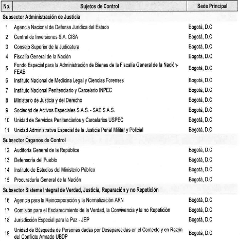 ARTÍCULO 10. CONTRALORÍA DELEGADA PARA EL SECTOR JUSTICIA. <Resolución derogada por el artículo 33 de la Resolución REG-EJE-0093 de 2021> La Contraloría Delegada para el Sector Justicia, será competente para ejercer la vigilancia y el control fiscal a los siguientes sujetos de control: