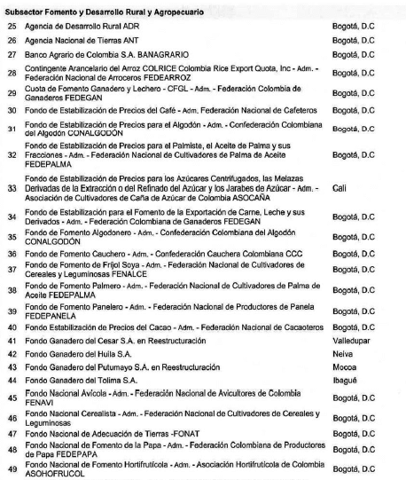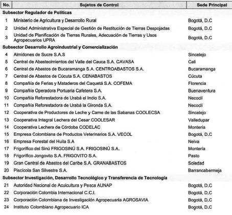 ARTÍCULO 2o. CONTRALORÍA DELEGADA PARA EL SECTOR AGROPECUARIO. <Resolución derogada por el artículo 33 de la Resolución REG-EJE-0095 de 2021> La Contraloría de legada para el Sector Agropecuario será competente para ejercer vigilancia y control fiscal a los siguientes sujetos de control: