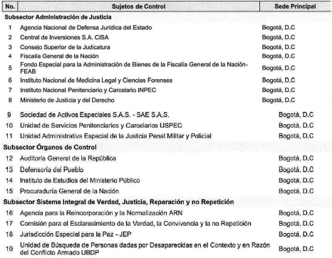 ARTÍCULO 10. CONTRALORÍA DELEGADA PARA EL SECTOR JUSTICIA. <Resolución derogada por el artículo 33 de la Resolución REG-EJE-0095 de 2021> La Contraloría Delegada para el Sector Justicia, será competente para ejercer la vigilancia y el control fiscal a los siguientes sujetos de control: