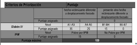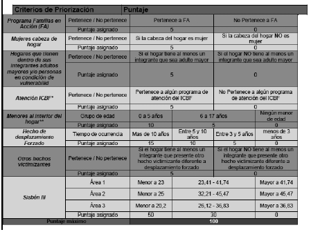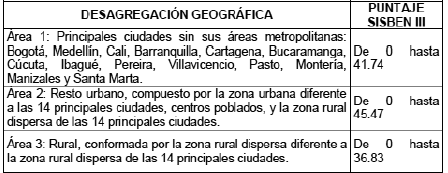 PARÁGRAFO. Para aquellos casos que se requiera la aplicación de los criterios de priorización con la metodología del Sisbén III se tendrá como referencia la siguiente tabla, lo anterior teniendo en cuenta el parágrafo 3 transitorio del artículo 6o de la presente resolución.