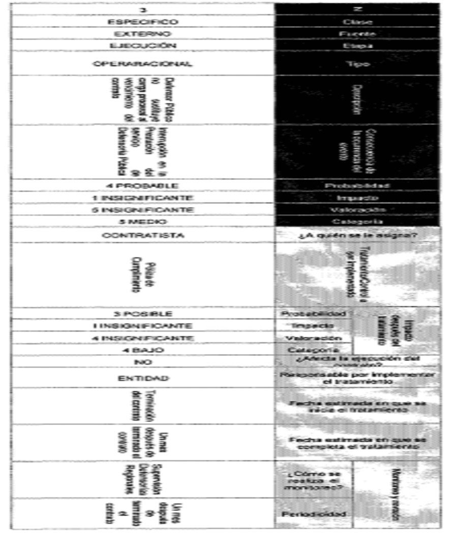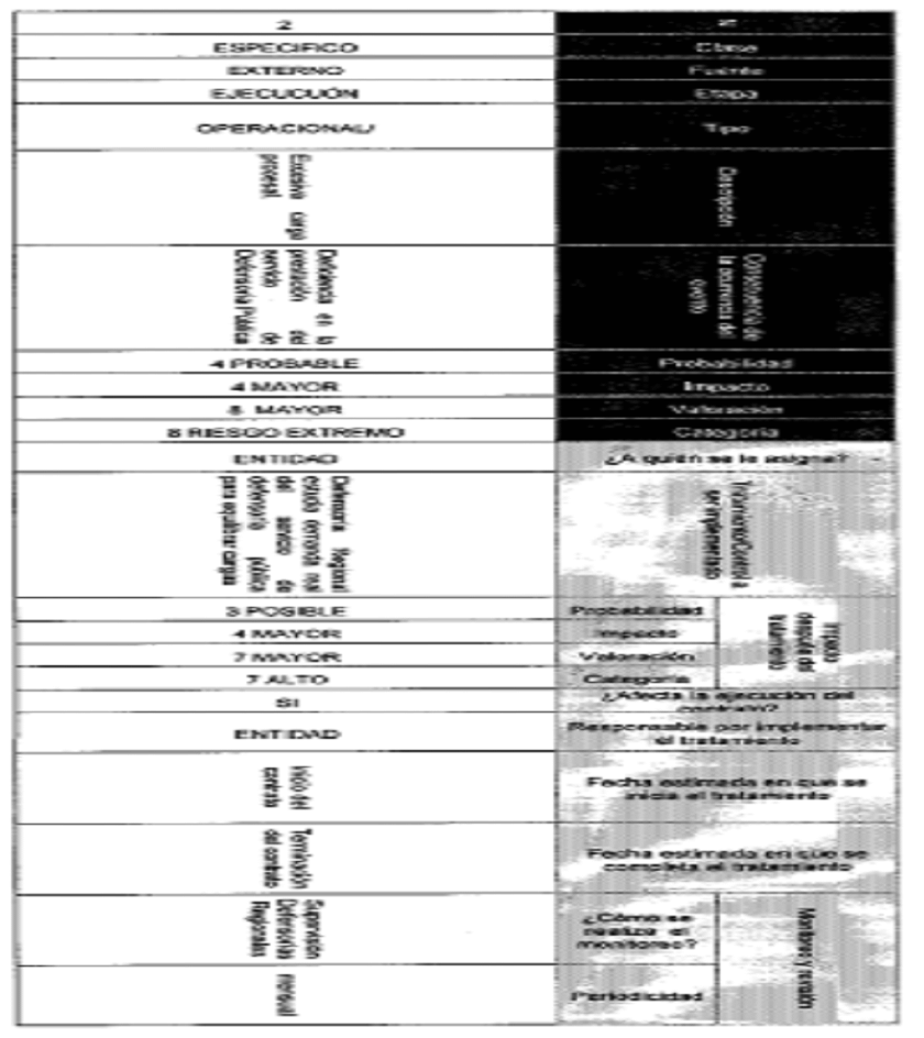 r) Matriz de Riesgos. De acuerdo con lo previsto en el artículo 4o de la Ley 1150 de 2007 y los lineamientos del manual de riesgos expedido por Colombia Compra Eficiente, en la Entidad, se han definido como riesgos dentro de la ejecución del presente contrato, los relacionados en la Matriz que se anexa a la presente Resolución y la cual hace parte integral de la misma y de los contratos de Defensoría Pública.