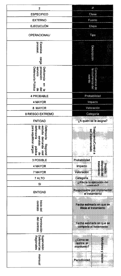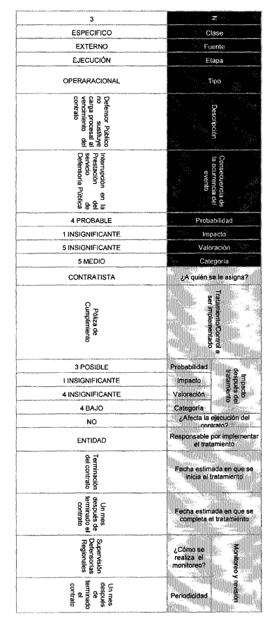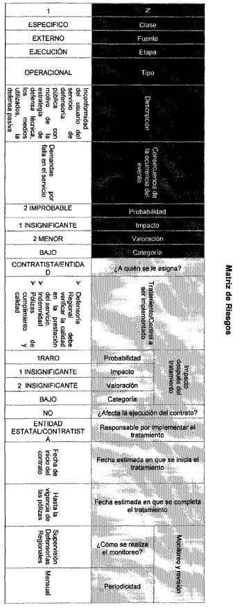 r) Matriz de Riesgos. De acuerdo con lo previsto en el artículo 4o de la Ley 1150 de 2007 y los lineamientos del manual de riesgos expedido por Colombia Compra Eficiente, en la Entidad, se han definido como riesgos dentro de la ejecución del presente contrato, los relacionados en la Matriz que se anexa a la presente Resolución y la cual hace parte Integral de la misma y de los contratos de Defensoría Pública.