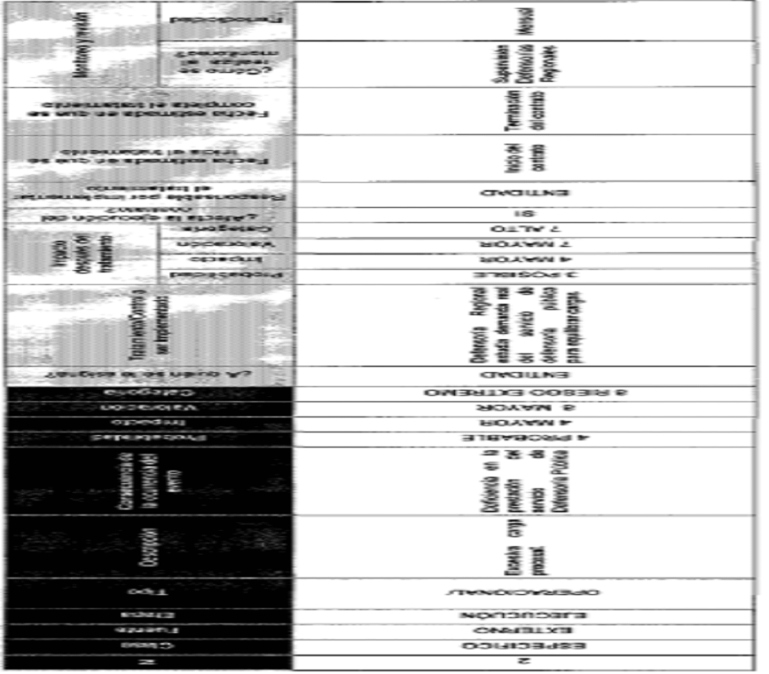 r) Matriz de Riesgos. De acuerdo con lo previsto en el artículo 4o de la Ley 1150 de 2007 y los lineamientos del manual de riesgos expedido por Colombia Compra Eficiente, en la Entidad, se han definido como riesgos dentro de la ejecución del presente contrato, los relacionados en la Matriz que se anexa a la presente Resolución y la cual hace parte integral de la misma y de los contratos de Defensoría Pública.