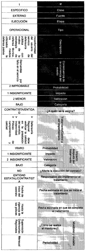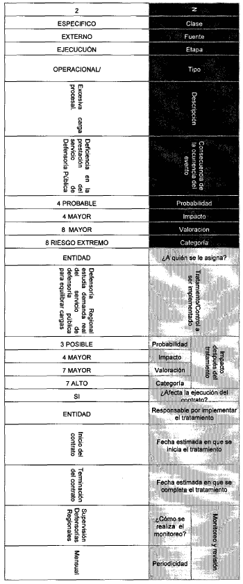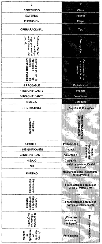 r) Matriz de Riesgos.- De acuerdo con lo previsto en el artículo 4o de la Ley 1150 de 2007 y los lineamientos del manual de riesgos expedido por Colombia Compra Eficiente, en la Entidad, se han definido como riesgos dentro de la ejecución del presente contrato, los relacionados en la Matriz que se anexa a la presente Resolución y la cual hace parte integral de la misma y de los contratos de Defensoría Pública.