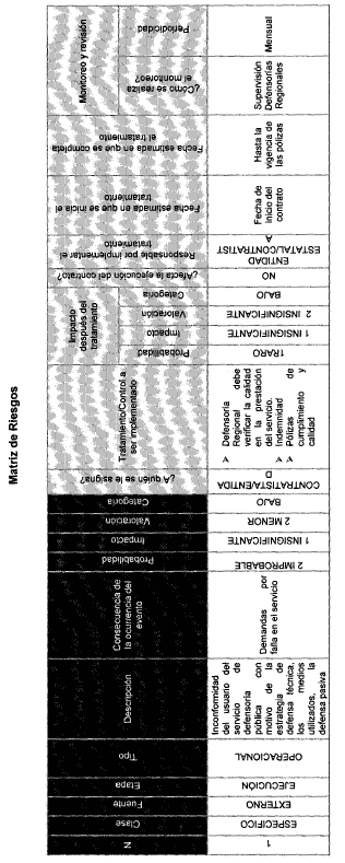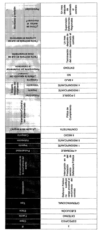 p) Matriz de Riesgos.- De acuerdo con lo previsto en el artículo 4o de la Ley 1150 de 2007 y los lineamientos del manual de riesgos expedido por Colombia Compra Eficiente, en la Entidad, se han definido como riesgos dentro de la ejecución del presente contrato, los relacionados en la Matriz que se anexa a la presente Resolución y la cual hace parte integral de la misma y de los contratos de Defensoría Pública.