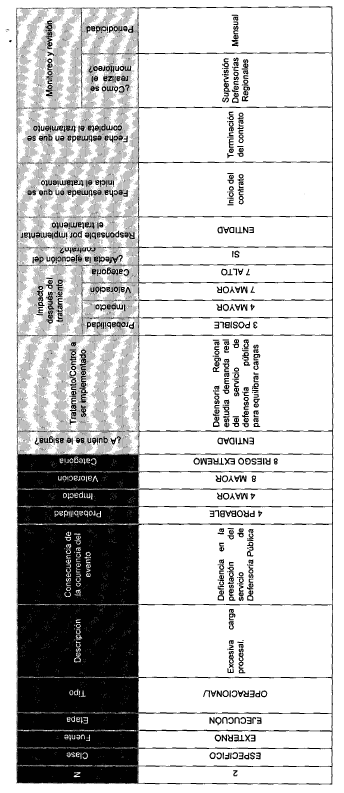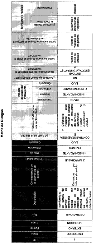 r) Matriz de Riesgos.- De acuerdo con lo previsto en el artículo 4o de la Ley 1150 de 2007 y los lineamientos del manual de riesgos expedido por Colombia Compra Eficiente, en la Entidad, se han definido como riesgos dentro de la ejecución del presente contrato, los relacionados en la Matriz que se anexa a la presente Resolución y la cual hace parte integral de la misma y de los contratos de Defensoría Pública.