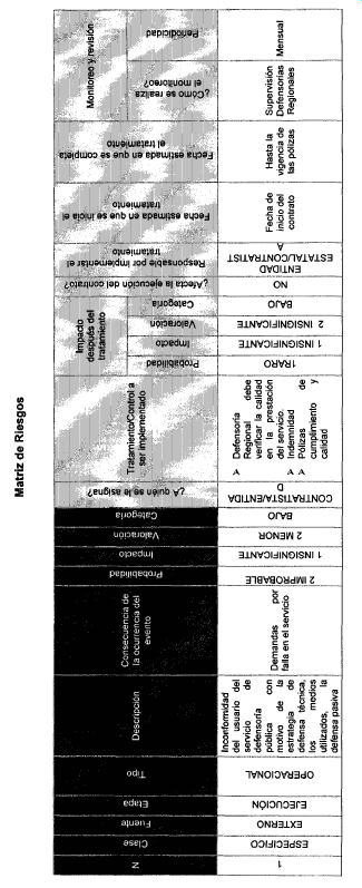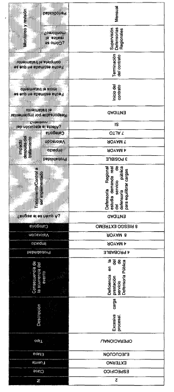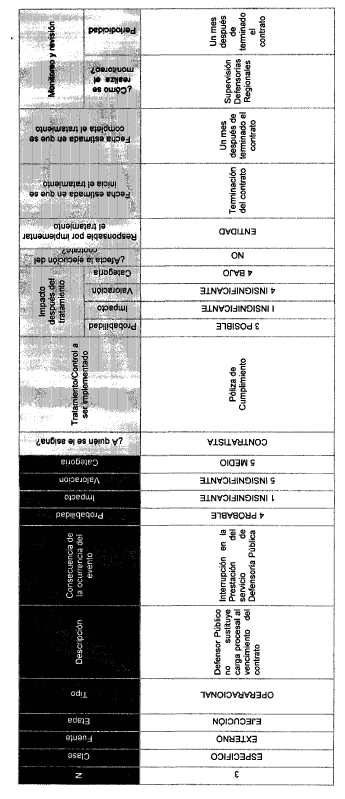 r) Matriz de Riesgos.- De acuerdo con lo previsto en el artículo 4o de la Ley 1150 de 2007 y los lineamientos del manual de riesgos expedido por Colombia Compra Eficiente, en la Entidad, se han definido como riesgos dentro de la ejecución del presente contrato, los relacionados en la Matriz que se anexa a la presente Resolución y la cual hace parte integral de la misma y de los contratos de Defensoría Pública.