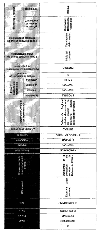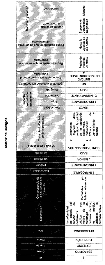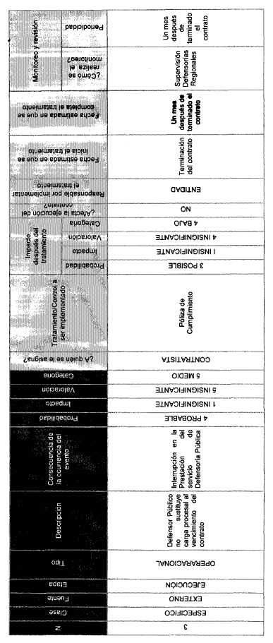 r) Matriz de Riesgos. De acuerdo con lo previsto en el artículo 4o de la Ley 1150 de 2007 y los lineamientos del manual de riesgos expedido por Colombia Compra Eficiente, en la Entidad, se han definido como riesgos dentro de la ejecución del presente contrato, los relacionados en la Matriz que se anexa a la presente Resolución y la cual hace parte integral de la misma y de los contratos de Defensoría Pública.