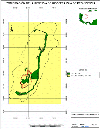 Zona núcleo: Zona de reserva forestal (incluye The Peak), los manglares (Santa Catalina, Town-Jones Point, Southwest Bay, Manchineel Bay y Old Town), el bosque denso (conservación de reservas hídricas) y el matorral de porte medio (conservación del suelo y agua).
