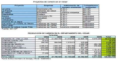 Como se observa, la principal empresa productora de carbón en este departamento es la Drummond Ltd, que produce cerca del 70% del total departamental y ha alcanzado el 33% del total nacional. Prodeco y Carbones de la Jagua vienen incrementando sus producciones. Carbones de los Andes, Carboandes, casi que ha desaparecido. El 99% de la producción de carbón en el Cesar se exporta. De acuerdo con las estadísticas reportadas por el Banco de la República, durante el año 2006 las exportaciones de carbón del país ascendieron a USD$2.913 millones, que representan del 11,9% de total nacional. Los principales departamentos productores son La Guajira y el Cesar.