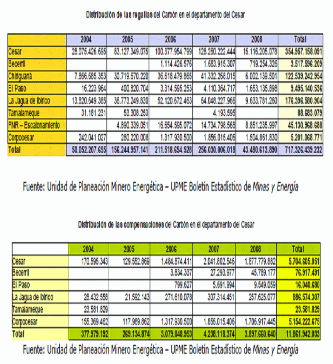 En la tabla siguiente se muestra el total de regalías y compensaciones recibido por cada entidad durante el periodo 2004 - 2008. Son cifras muy altas que representan importantes recursos económicos para mejorar las condiciones de los habitantes de estas zonas. La Jagua de Ibirico, Chiriguaná y la Gobernación del Cesar son los que más recursos perciben por este motivo.