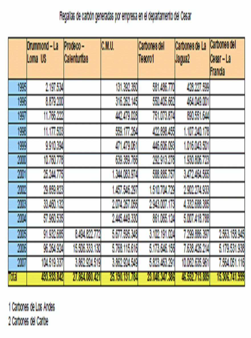 La empresa Drummond, como principal explotadora de carbón del departamento, ha sido la mayor generadora de regalías desde 1995, como se aprecia en la tabla.