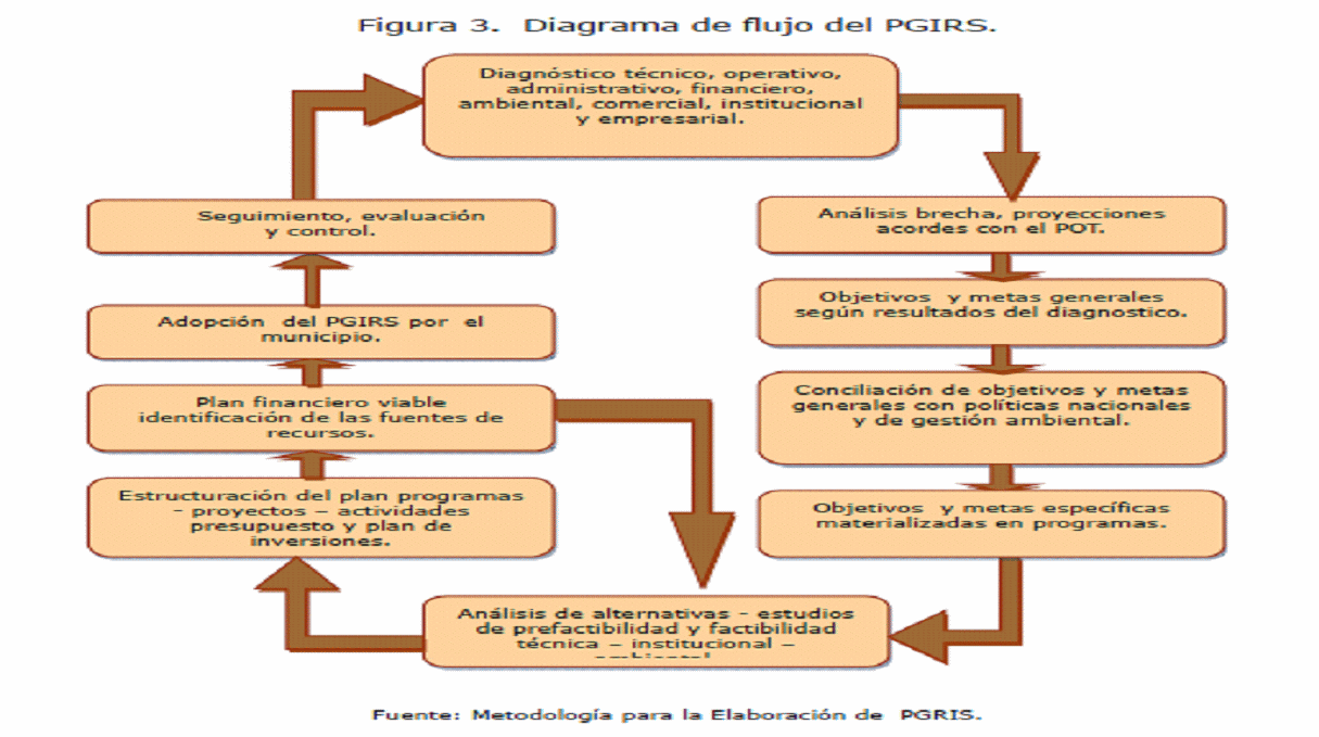 105. Decreto 1713 de 2002. "Por el cual se reglamenta la Ley 142 de 1994, la Ley 632 de 2000 y la Ley 689 de 2001, en relación con la prestación del servicio público de aseo, y el Decreto Ley 2811 de 1974 y la Ley 99 de 1993 en relación con la Gestión Integral de Residuos Sólidos". Artículo 8, modificado por el Decreto 1550 de 2003. “Artículo 2o. El artículo 8o del Decreto 1713 de 2002 quedará así: Artículo 8o. Plan para la Gestión Integral de Residuos Sólido, PGIRS. A partir de la vigencia del presente Decreto, los Municipios y Distritos, deberán elaborar y mantener actualizado un Plan Municipal o Distrital para la Gestión Integral de Residuos o Desechos Sólidos en el ámbito local y/o regional según el caso, en el marco de la política para la Gestión Integral de los Residuos, el cual será enviado a las autoridades ambientales competentes, para su conocimiento, control y seguimiento. El Plan se diseñará para un período acorde con el de los Planes de Desarrollo Municipal y/o Distrital según sea el caso. La ejecución del Plan para la Gestión Integral de Residuos Sólidos PGIRS, se efectuará en armonía y coherencia con lo dispuesto en los Planes de Ordenamiento Territorial y en los Planes de Desarrollo de Nivel Municipal y/o Distrital. El plazo máximo para la elaboración de iniciación de la ejecución del PGIRS es de dos (2) años contados a partir de la fecha de publicación de la metodología que para el efecto expida el Ministerio de Ambiente, Vivienda y Desarrollo Territorial. El PGIRS debe estar a disposición de las entidades de vigilancia y control de la prestación del servicio de aseo y de las autoridades ambientales, quienes podrán imponer las sanciones a que haya lugar, en caso de incumplimiento.”