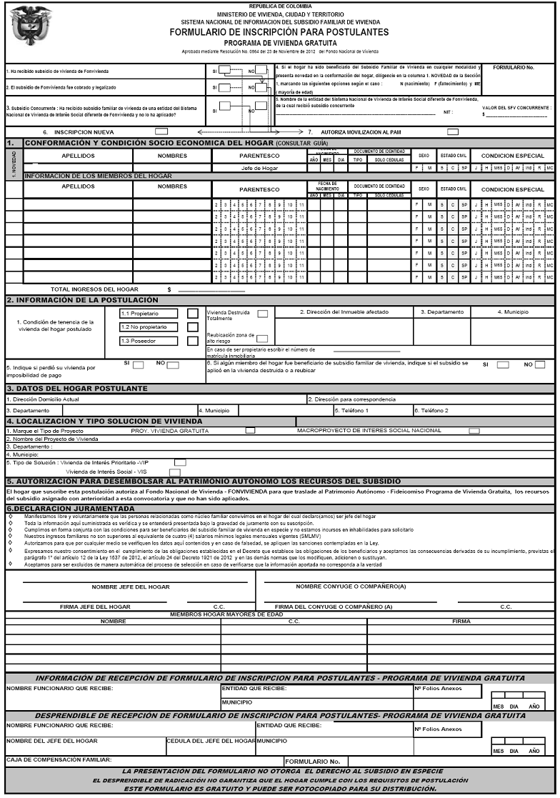 Que con el fin de dar cumplimiento a lo establecido en el Decreto número 1921 de 2012, se hace necesario adoptar el Formulario de Inscripción para Postulantes al Programa de Vivienda Gratuita.
