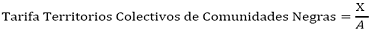 ARTÍCULO 4o. FÓRMULA TARIFARIA. Para ejecutar la metodología que establece esta resolución, se plantea la expresión tarifa territorio colectivo de comunidades negras, que representa la ecuación del promedio ponderado de las tarifas del IPU del municipio o distrito a calcular, cuyo resultado será el valor a multiplicar por los avalúos catastrales de los territorios colectivos de comunidades negras existentes.