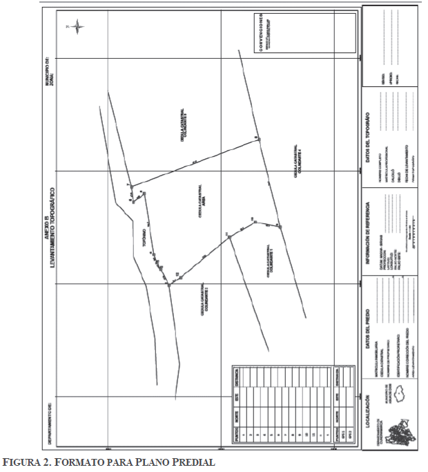 PLANO: contiene el plano generado del levantamiento según los parámetros del formato Anexo B. Se deben entregar en formatos.dxf y.pdf proyectado en coordenadas cartesianas locales.