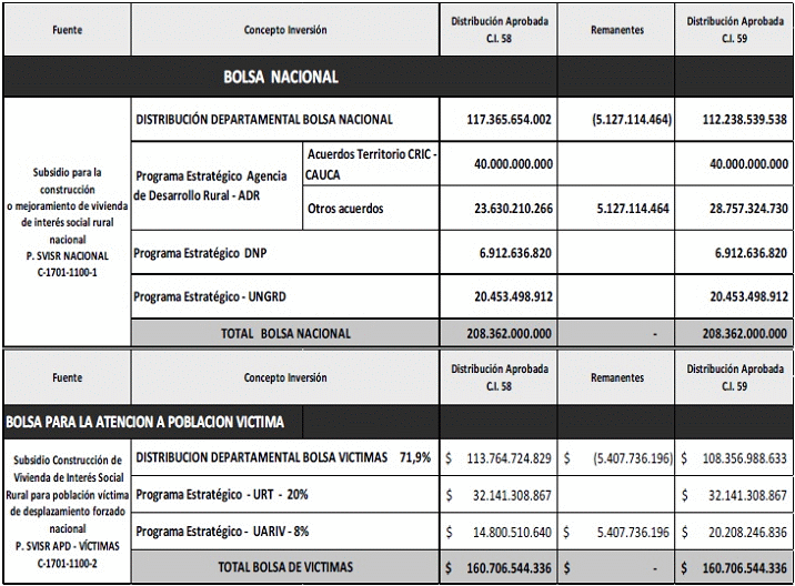 Que la Comisión Intersectorial de Vivienda de Interés Social Rural, según consta en Acta No. 59 del 4 de diciembre de 2017, recomendó al Ministerio de Agricultura y Desarrollo reasignar hasta el cinco por ciento (5%) de los excedentes residuales sin adjudicar en programas estratégicos y/o de desarrollo rural, y el excedente que quede de dicha distribución redistribuirlo en los departamentos y municipios priorizados, teniendo en cuenta las familias calificadas y habilitadas para tal fin, de acuerdo con el artículo 2.2.1.3.5 y 2.2.1.3.6 del Decreto Único Reglamentario 1071 del 2015. Para el caso de la bolsa de Víctimas se distribuirá en el Programa Estratégico con la UARIV y para el caso de la Bolsa Nacional al Programa Estratégico con la ADR.