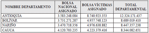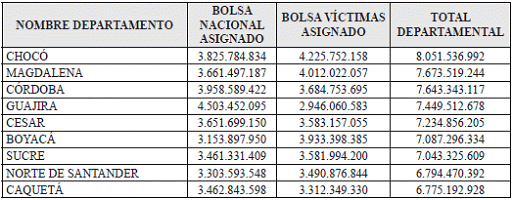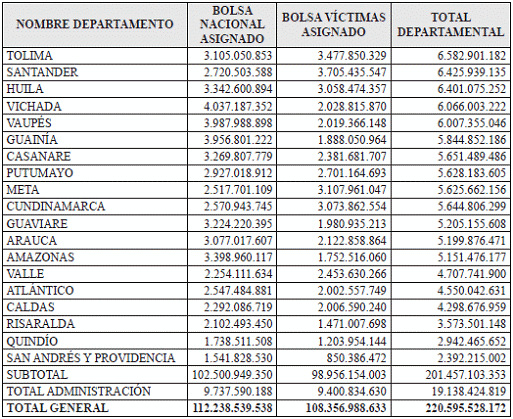 ARTÍCULO 2o. REDISTRIBUCIÓN DEPARTAMENTAL. La redistribución departamental de la Bolsa Nacional y la Bolsa para la Atención a Población Víctima será la que corresponde al siguiente cuadro: