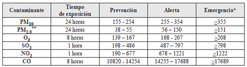 Tabla No. 4. Concentraciones (íg/m3) para los Niveles de Prevención, Alerta o Emergencia