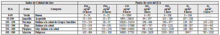 ARTÍCULO 20. PUNTOS DE CORTE DEL ICA. En la Tabla número 6 se presentan los puntos de corte del índice de calidad del aire respecto a los contaminantes criterios.