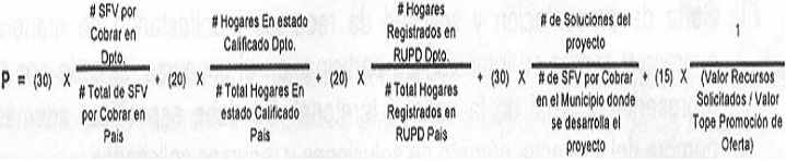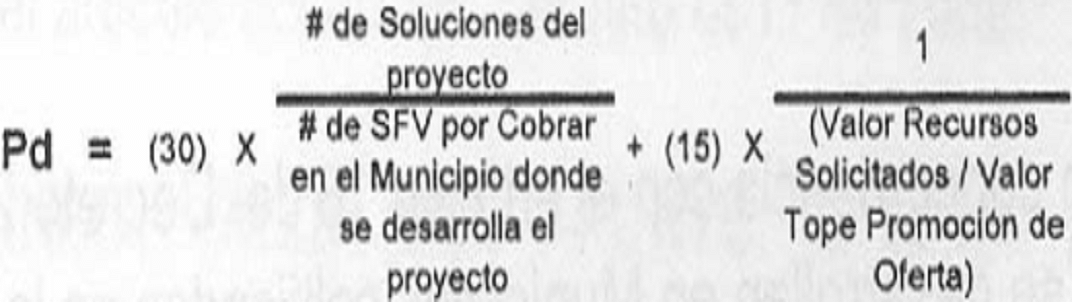 PARÁGRAFO 3o. En caso de empate en la calificación, se favorecerá al plan de vivienda que brinde mayor número de soluciones con respecto al número de subsidios por cobrar en el Municipio, sumado al menor requerimiento de recursos de promoción de oferta y Demanda, aplicando la siguiente fórmula: